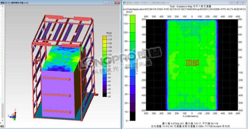 由图示可见:未优化前的方案存在布光不均匀,死角较多的情况,两分钟内难于达到杀菌预期。